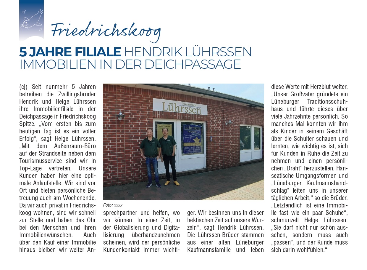 *********************************************************** Herzlich willkommen in Büsum ! "Prolog der Farben im Spiel der Gezeiten " Am 28. und 29.10.2017 setzte eine renommierte Hamburger Licht-und Gegenwartskünstlerin unser Büsumer Hochhaus in ein neues Licht und interpretierte durch Farbkompositionen das Gebäude neu. ************************************************************ Als Lüneburger betreuen wir sehr gerne auch Kunden aus unserer Heimatstadt .Wir freuen uns auf Ihren Besuch ! **************************************************** Das Nordseeheilbad Büsum liegt in der Metropolregion Hamburg nur eine gute Autostunde von der Hansestadt entfernt. Mit der neuen Lagune in der Perlebucht wartet hier ein neues Badeparadies auf Sie ! Die Einkaufsstrasse begeistert mit trendigen Geschäften. Und genau hier im Zentrum an der alten Fischerkirche freuen wir uns auf Ihren Besuch ! ************************************************************ Willkommen in unserem Kontor auf der Büsumer Kirchwarft in der "Büsumer Rosenvilla" der Familie Lührssen ! Blick von den Privat-Terrassen und Balkons des Büsumer Hochhauses Residieren in feinster Nordseelage Das Büsumer Hochhaus- Am Kurpark 1- "An den Nordseewellen" Diese feine Adresse gehört wohl zu den nachgefragtesten und prestigereichsten Wohnlagen des Nordseebades. Mittlerweile gönnen sich immer mehr Hamburger hier eine Eigentumswohnung und geniessen den spektakulären und unverbaubaren Meerblick.Und genau für diese Klientel suchen wir laufend weitere Eigentumswohnungen zum Kauf. Als Familie dürfen wir selbst seit nunmehr 40 Jahren diese besondere Adresse unser Zuhause nennen. Daher gehört Hendrik Lührssen Immobilien zu den natürlichen ersten Ansprechpartnern bei der Vermittlung von Eigentumswohnungen im Büsumer Hochhaus. Gerne bieten wir auch Ihnen diese erstklassige Lage an. **********************************************************